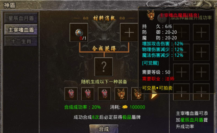 高阶合成:如青铜盾×2 + 涅槃神石×3→白虎盾(防御+120,暴击伤害+10%)。